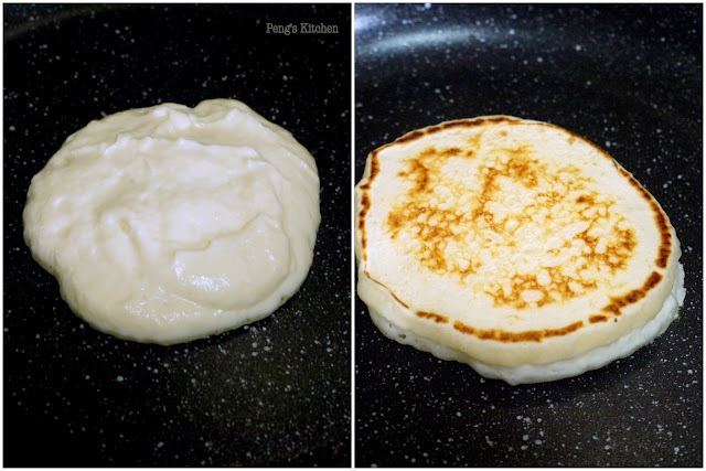 - Lightly grease a non stick pan. Drop about 1/4 cup batter into hot pan and pan fry over low heat till golden brown at the base. Flip over and cook the other side. Repeat till batter is completed.